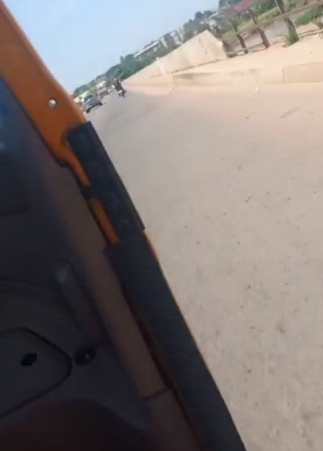 ride in an auto rickshaw over a bridge. The camera is positioned inside the vehicle, showing the door and the outside environment. The vehicle moves along a paved road with a concrete barrier on one side. Other vehicles, including a motorcycle and cars, are visible on the road. The bridge crosses a wide river with sandbanks and sparse vegetation. The sky is clear and blue.