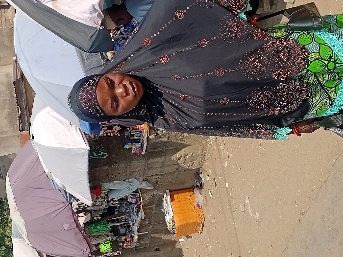 A woman in a black hijab with circular brown patterns stands outdoors. She wears a colorful green and blue patterned garment underneath. Above her are several open umbrellas, suggesting a market or outdoor vendor setting. Boxes and various merchandise are visible, scattered around. The ground appears to be a paved area. The image is shot at an angle.