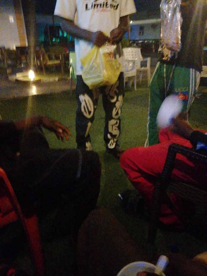 Three individuals occupy an outdoor space. One, wearing a white shirt with "Limited" on it and pants adorned with large white symbols, holds a yellow bag. Another person in green sweats with stripes carries a clear bag. Two others are seated, one in red attire, and the other in black. Artificial turf covers the ground, and seating can be seen in the background. The photo is taken at night.