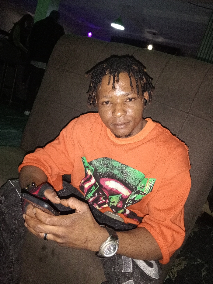 A person with dreadlocks sits on a couch, holding a smartphone. They wear an orange long-sleeved shirt with a graphic print, dark jeans, and a silver watch. A black ring is visible on their finger. The setting appears to be indoors, potentially a dimly lit bar or lounge, with other people in the background. A green hanging light is visible in the background.