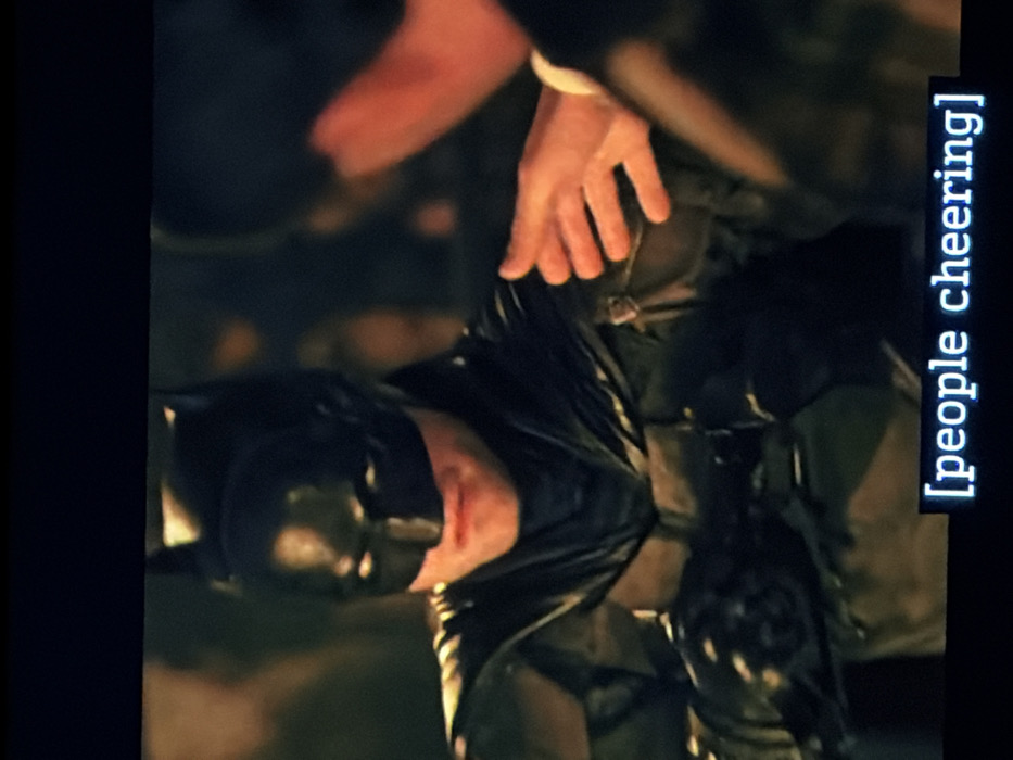 Batman in his suit, lying down with a hand reaching towards him. The scene appears dark and possibly injured. Subtitles on the right side read "[people cheering]" suggesting an off-screen reaction to the scene. The quality is grainy, indicating it may be a still from a video.