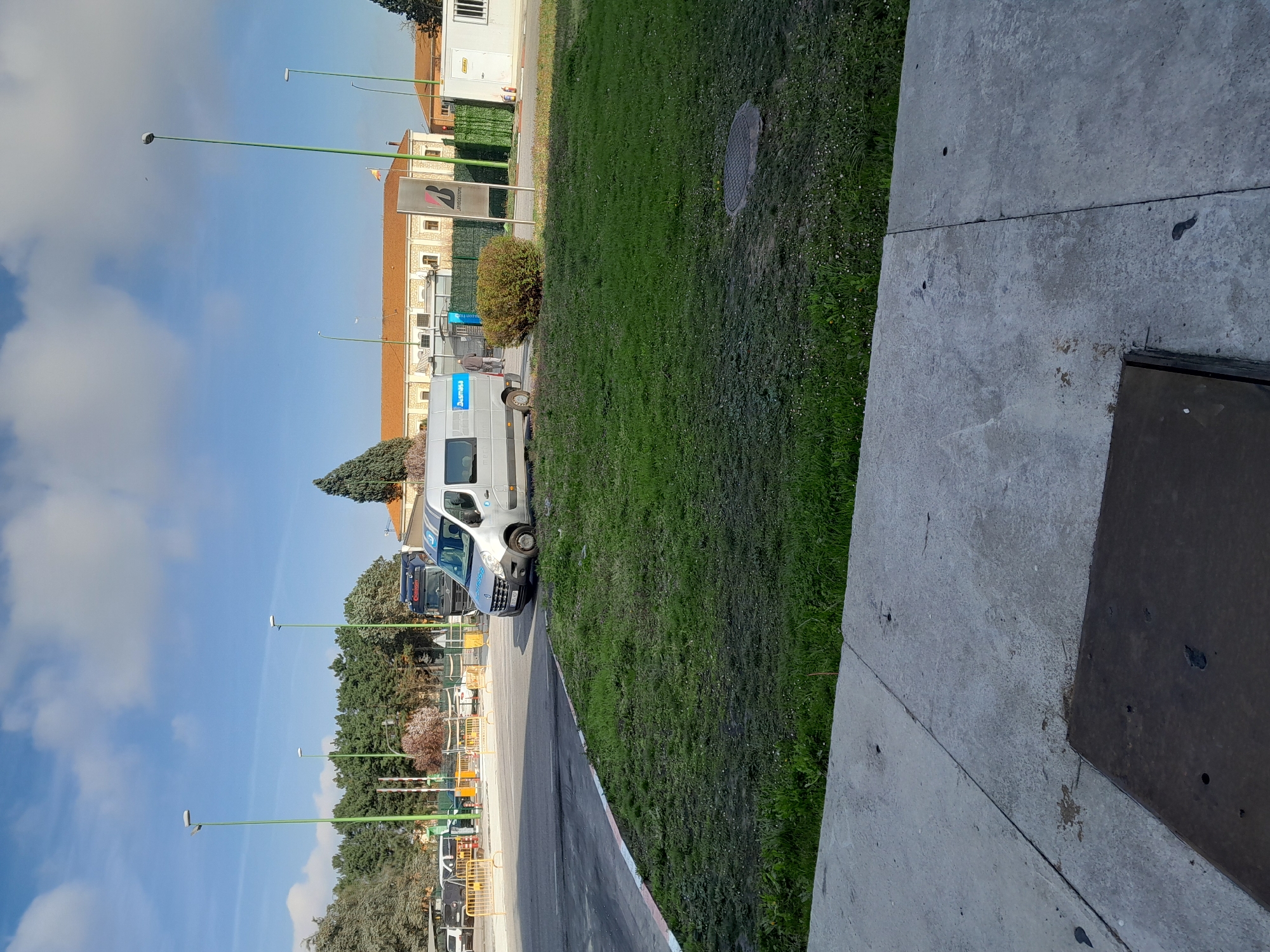 The image depicts an outdoor industrial or commercial area in Burgos, Spain, under a partly cloudy blue sky. In the immediate foreground, a grey concrete sidewalk with an intersecting seam features a dark rectangular access panel on the lower left. Adjacent to the sidewalk, a strip of sparse green grass contains a circular metal manhole cover in the lower right. A light grey Renault Kangoo van, bearing the "Jusmasa" logo and "mercadona.com" text on its side, is parked in the midground, partially on the asphalt road and partially on the grass verge, with its front driver's side wheel on the dirt. The van's license plate, "4373 HGP", is visible. To the left of the van, the road features white and red/orange painted lines. Further left, an asphalt area with yellow construction barriers and white plastic barriers suggests an entry or exit point for vehicles. Several vehicles, including a dark semi-truck with "Grupo Cordon" visible on its cab, are parked in the background behind these barriers. Beyond the van and the Bridgestone sign, a single individual wearing dark clothing walks away from the viewer, moving toward a blue structure. To the right of the van, a tall, slender black Bridgestone sign stands near a small, dense green bush. A Spanish flag flies from a pole behind the Bridgestone sign. A green metal fence runs horizontally across the midground. In the background, a line of dense evergreen trees forms a natural barrier. Behind the fence and trees, several buildings with light-colored facades and reddish-brown tiled roofs are visible. One prominent building has multiple windows. To the far right, a smaller white prefabricated building is situated. Multiple tall, slender green lampposts are distributed throughout the scene. The overall lighting suggests daylight conditions, with shadows cast by objects indicating the sun is overhead or slightly to the left.