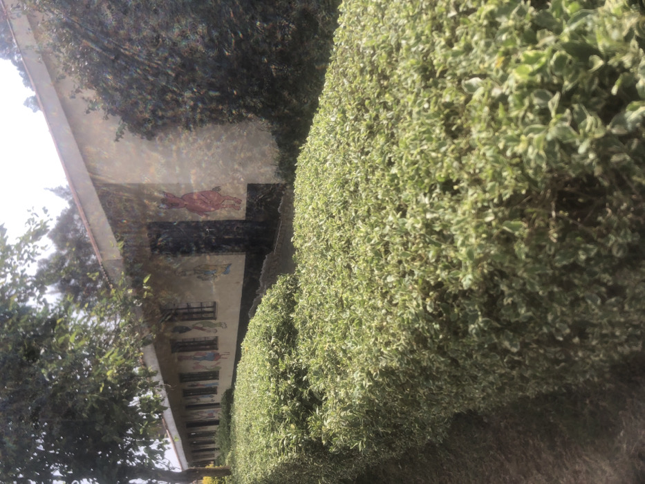 A low-angle perspective shows a building exterior adorned with colorful murals and windows running along its length. To the right, a dense, light green bush stands in sharp contrast to the building's facade. Scattered foliage adds to the natural elements in the scene. The image appears to be slightly tilted.