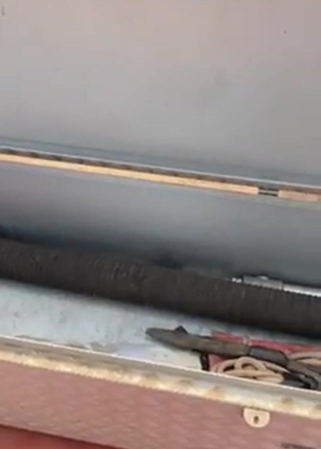top of a fire truck. A silver diamond plate storage box is opened to reveal a black hose and various tools inside. The box is closed, and the camera shows a water cannon mounted on the flat red bed of the truck. A ladder is visible on the side. Several people are seen standing near the truck, including at least two uniformed individuals. A red pickup truck is parked nearby.