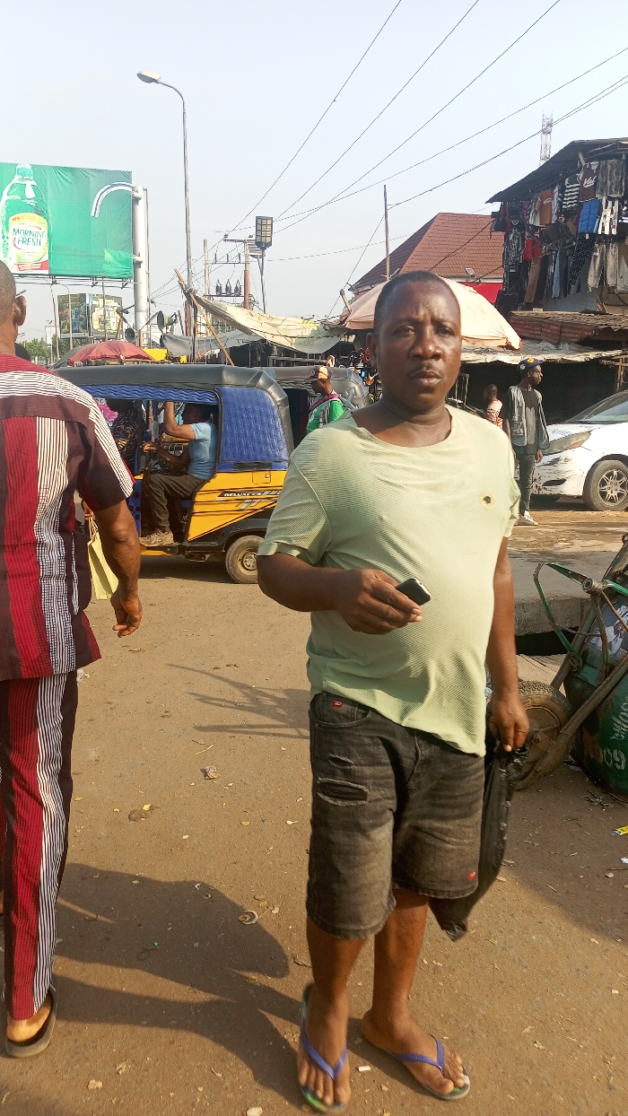 The image depicts an unpaved, busy urban market street in the city of Unknown, Unknown, under clear daylight conditions. In the foreground, a dark-complexioned male, appearing mid-adult, stands centrally, facing the camera. He wears a light green short-sleeved t-shirt, dark distressed denim shorts, and blue and green flip-flops. He holds a black smartphone in his right hand and a black plastic bag in his left. To his left, a second dark-complexioned male walks away from the camera, dressed in a red, white, and black vertically striped tunic and dark trousers. Behind them, a yellow and blue motorized tricycle, labeled 'DUALTECH', is positioned mid-ground left, occupied by a male driver in a light blue shirt. The background features a large green billboard for 'Morning Fresh' on the left, a tall street lamp, and numerous overhead power lines. On the right, multiple market stalls are visible, including a multi-story building with a red roof from which various clothing items are displayed for sale. A white sedan is partially visible further down the street on the right. The ground is dusty and shows scattered debris, with long shadows indicating a low sun angle.