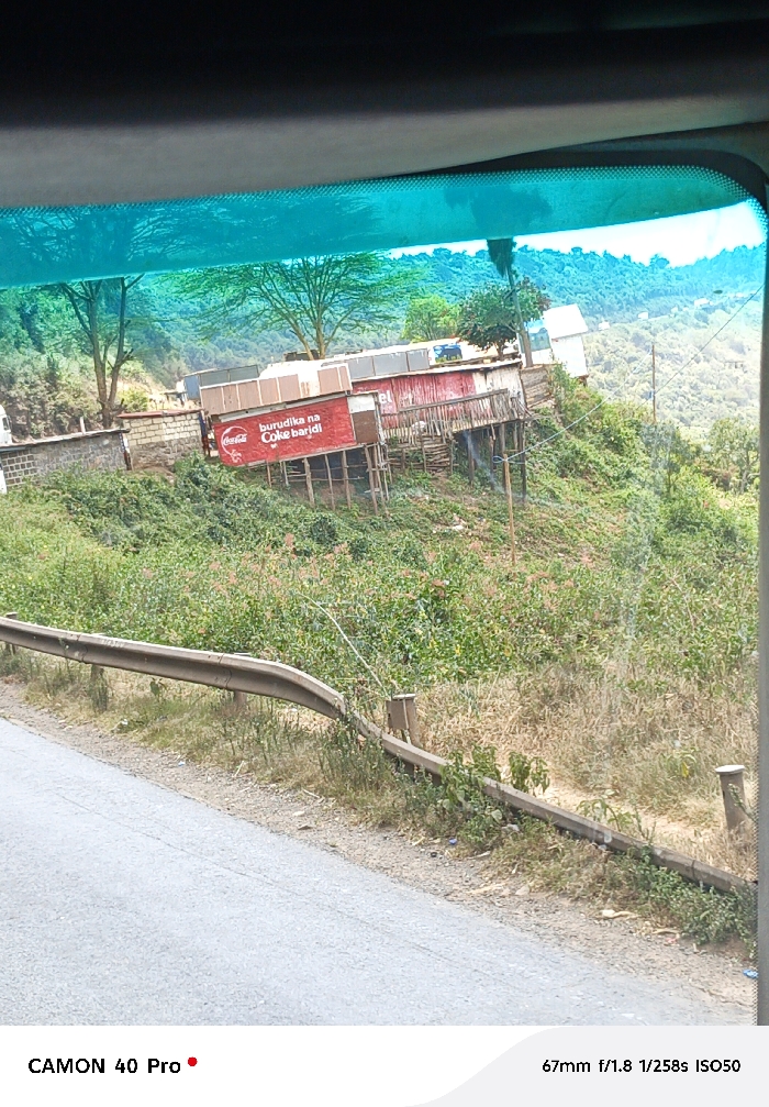 A roadside scene with a commercial structure advertising Coca-Cola in what appears to be Swahili, "burudika na Coke baridi," translating to "refresh with cold Coke." The building is perched on a hillside amidst lush vegetation, with a view of rolling hills in the background. A damaged guardrail runs alongside the road, and the photograph appears to be taken from inside a vehicle, as evidenced by the tinted windshield. The image is captured with a CAMON 40 Pro, using a 67mm lens at f/1.8, with a shutter speed of 1/258s, and an ISO of 50.