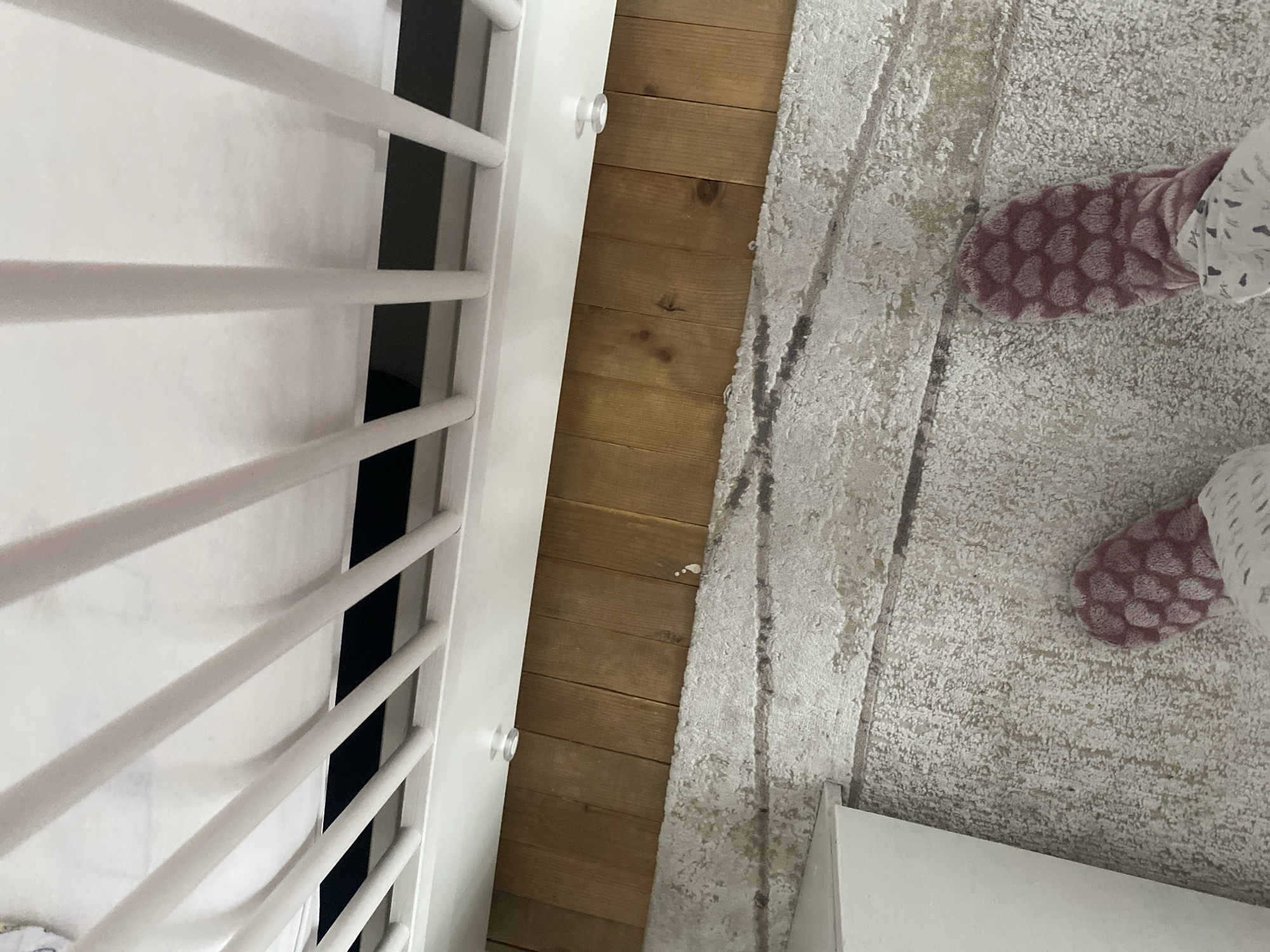 A high-angle shot captures a domestic scene featuring a white cot or crib to the left. The cot's slats are visible, and there is a glimpse of a dark interior through the gaps. Adjacent to the cot is a wooden floor. To the right of the floor is a light-colored area rug with a textured pattern. The lower right corner of the rug has a pair of feet clad in rose-colored slippers. The background location is not identifiable as Blagoevgrad, Bulgaria, based on the provided image.