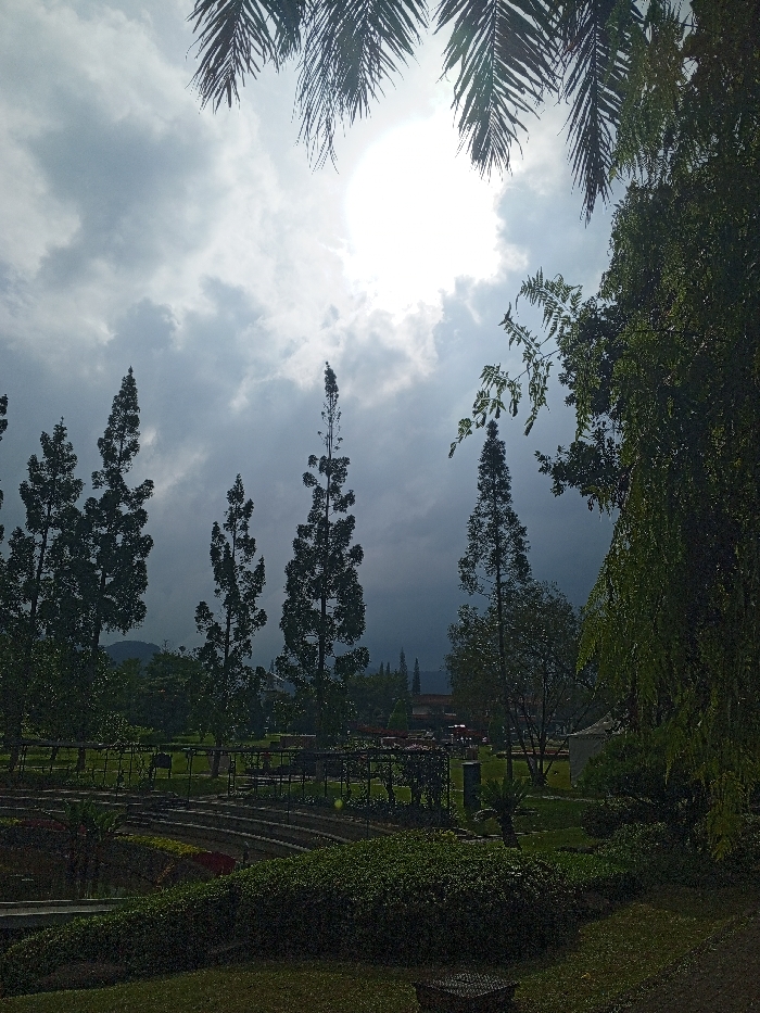A park landscape under a cloudy sky. Tall, slender trees line the horizon, their silhouettes contrasting against the bright sun obscured by clouds. Palm fronds frame the top of the image. Lush green foliage fills the foreground, with tiered garden beds leading to a grassy field. Structures and figures are visible in the distance, adding depth to the scene. A sense of serenity and natural beauty pervades the view.