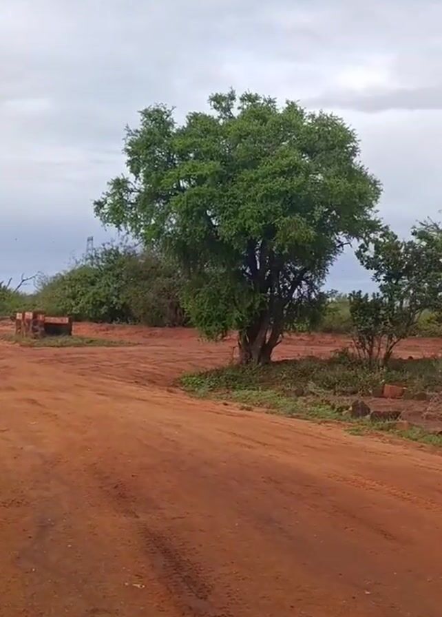 n unpaved, red dirt road in a rural area under an overcast sky. Several individuals are walking along the road. Trees and shrubs line the sides of the road. There is a sign visible, though the text is not clearly discernible. The road shows tire tracks. Power lines are visible in the distance.