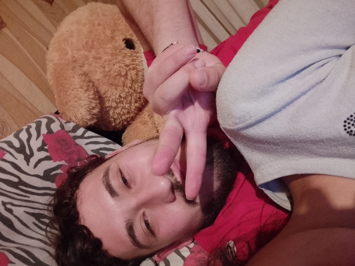 The image displays an indoor scene, consistent with a residential setting, stated to be in Roman, Bulgaria. A male individual with dark, curly hair, a beard, and a mustache is depicted lying on his back. His eyes are partially closed, and he is wearing a red garment. He rests on bedding characterized by a black and white zebra stripe pattern interspersed with red roses. An arm, with pale skin, enters the frame from the upper right. This arm, adorned with a thin dark bracelet, is clad in a light gray sleeve featuring a dark, circular, patterned emblem. The hand of this arm is positioned over the male's face, with the index and middle fingers extended to form a "V" shape, commonly known as a peace sign. Behind the male's head, partially visible on the bedding, is a large, light brown, fluffy stuffed animal. Wooden paneling, possibly a floor or wall, is visible in the upper left background.