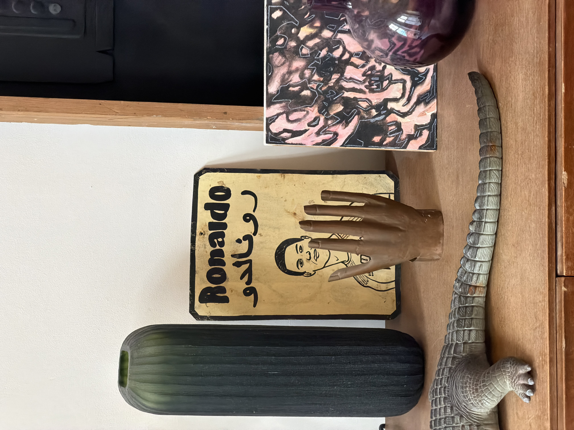 The image depicts a collection of objects arranged on a shelf. The objects are placed against a light beige wall and a wooden panel. From left to right, and top to bottom: - A dark gray object is partially visible in the top left corner, possibly a speaker or electronic device. - An abstract painting with patterns in pink, black, and white. A shiny, purple spherical object is also present on top of the painting. - A rectangular gold sign with the name "Ronaldo" written in black English letters and Arabic script. A black and white drawing of a person's face is on the sign, and a wooden hand is positioned on the sign. - A long, dark green, cylindrical object with a ribbed texture. - A gray crocodile figure lying with the tail oriented upwards. The scene appears to be indoors. There is no explicit indication of Harborough, United Kingdom.