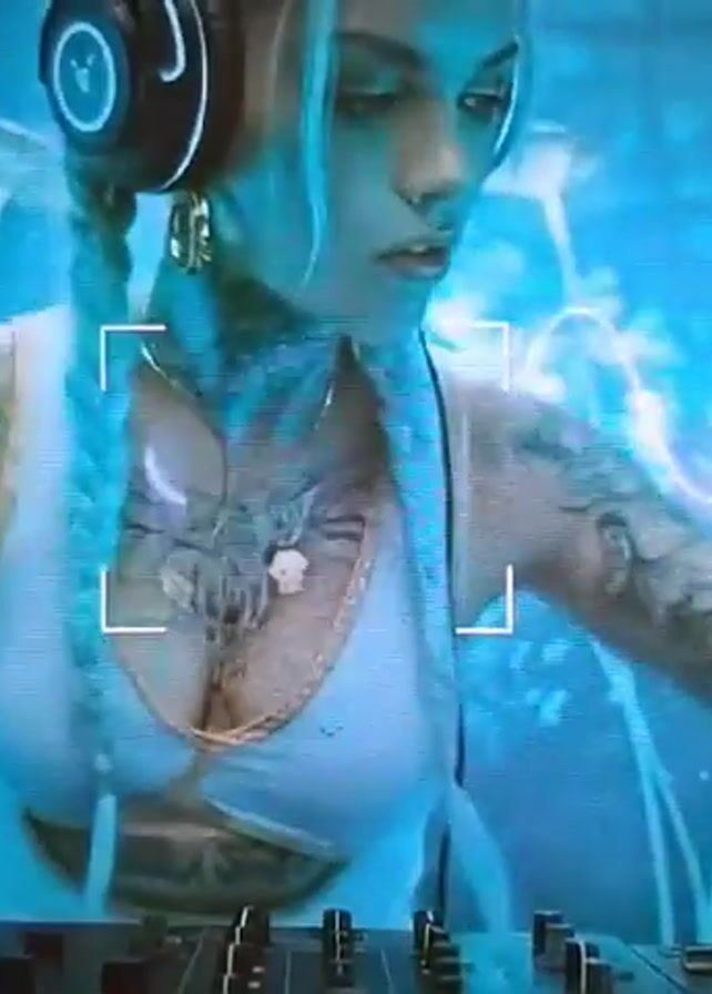 A low-angle shot focuses on a young woman DJ, seen from the chest up