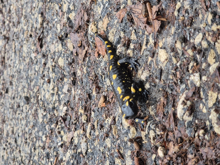 - "A black fire salamander (Salamandra salamandra) with prominent irregular yellow spots on its dorsal side is positioned on a damp, dark asphalt surface" by FM-i5YF22, licensed under CC BY 4.0