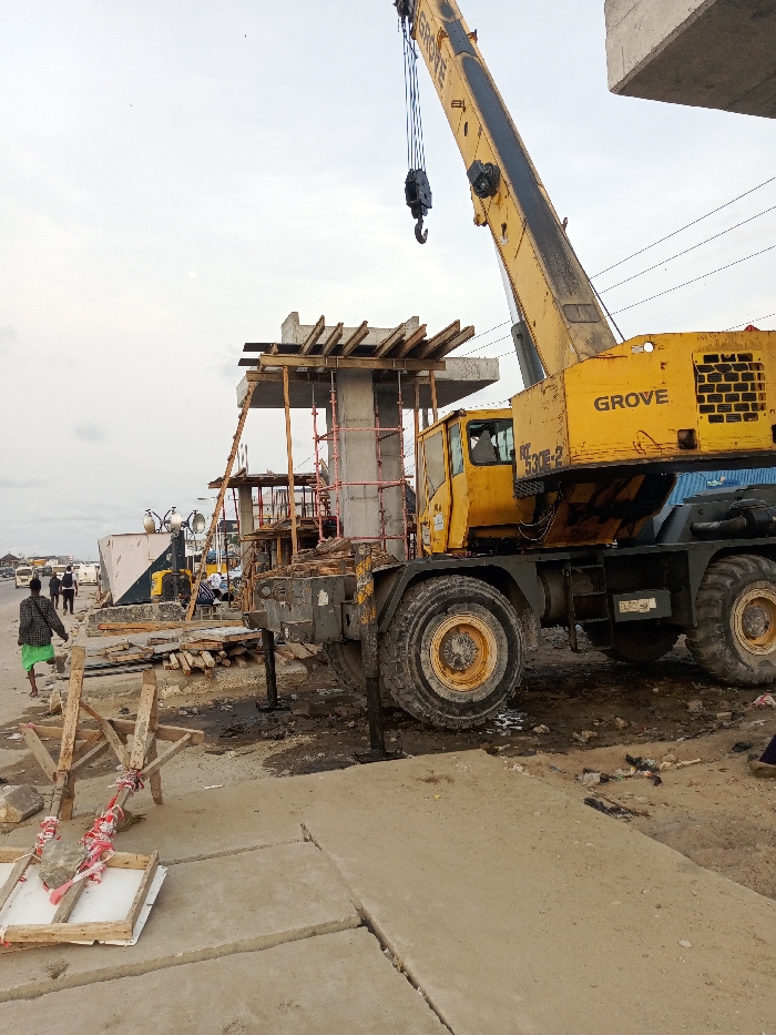 yellow Grove crane lifting a large concrete slab in Lekki, Nigeria (latitude: 6