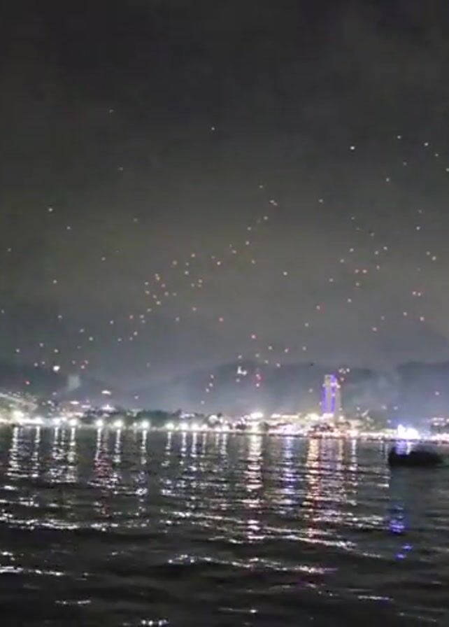 nighttime scene of a body of water with fireworks going off in the distance. The water is dark and reflects the lights of the city skyline and fireworks. In the distance, there are hills and a city skyline with several buildings. There are some boats in the water. The fireworks are colorful and explode in the sky. There is a lot of smoke in the air. There are people talking in the background, but they are not visible in the video.