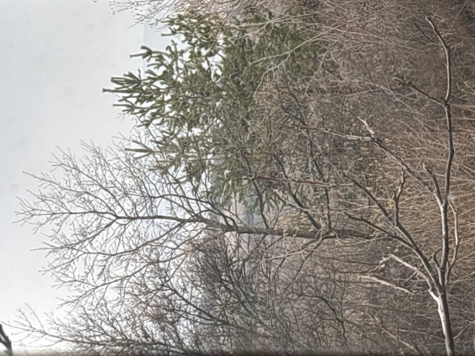The image depicts an outdoor natural environment located in Bistritsa, Bulgaria. The scene is dominated by a dense arrangement of leafless deciduous trees and evergreen coniferous trees under a uniformly light grey, overcast sky. In the immediate foreground, a thick, bare deciduous tree branch extends horizontally from the lower left towards the right, featuring smaller, intricate twigs. The midground is densely populated with various tree types. Several tall, bare deciduous trees, devoid of foliage, display complex networks of thin, brown branches, with one prominent specimen centrally located and reaching towards the top of the frame. Interspersed among these, particularly on the right side of the midground, are multiple coniferous trees with green needles, providing a color contrast. The lower and central sections of the image are filled with dense, tangled undergrowth consisting of numerous leafless shrub branches and smaller trees, appearing in shades of brown and grey. A hazy, lighter area in the distant background is visible through gaps in the tree canopy, suggesting open terrain or distant hills. No human subjects, animals, or man-made structures are observed within the frame. The diffused lighting is consistent with an overcast sky, indicating a winter or early spring season.