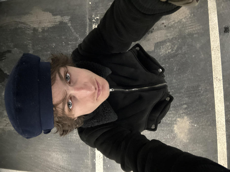 A low-angle selfie depicts a person wearing a dark blue cap and a black jacket with a silver zipper. The jacket has a sherpa collar. The person's face is visible, with light skin, blue eyes, and brown hair peeking out from under the cap. The background is a grey surface with white lines. The photo appears to have been taken in a parking garage or similar location.
