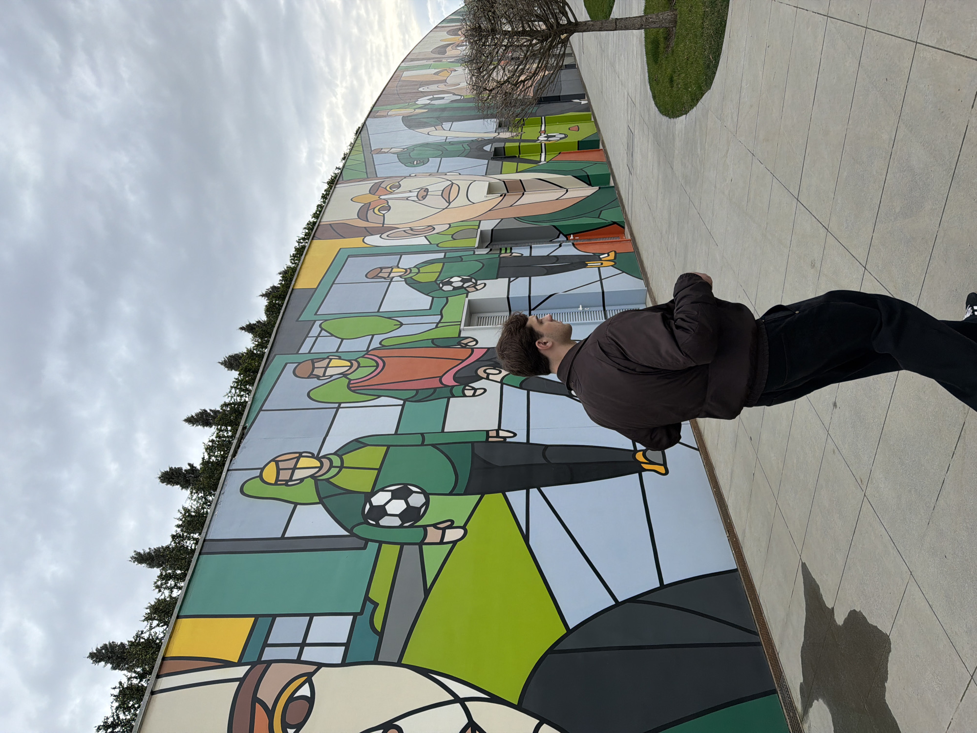 A man wearing a dark jacket and black pants stands on a tiled surface, facing a large, vertical mural. The mural features stylized figures of people in various poses, with soccer balls and a predominantly green, yellow, and orange color scheme. The artwork has a cartoon-like aesthetic. Along the top edge of the mural, trees are visible, extending towards a cloudy sky. A tree with bare branches is present near the upper right corner of the frame, adjacent to a patch of grass. The mural appears to be affixed to a building wall. The setting is likely a public space, given the tiled surface and the presence of the mural. This image captures the iconic soccer mural located in Krasnodar, Russia.