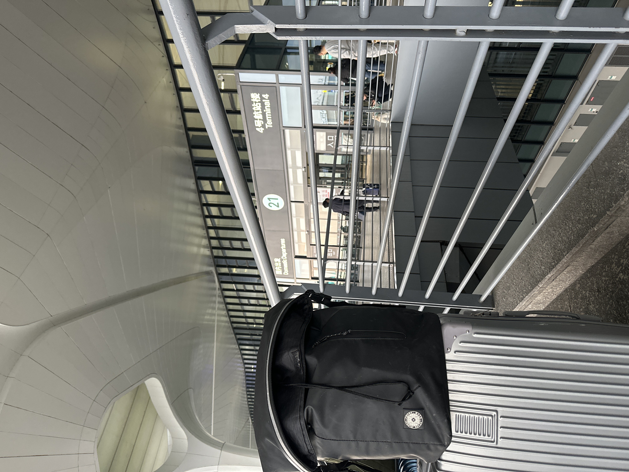 The image depicts an exterior view of Terminal 4 at Hangzhou Xiaoshan International Airport in Xiaoshan District, China. In the immediate foreground, a silver metallic suitcase with vertical ridging and reinforced corners is positioned on a grey concrete surface, topped by a black roll-top backpack featuring a drawstring closure, a zippered front pocket, and a circular emblem. A grey metal railing system, composed of horizontal bars and vertical supports, spans the midground, separating the viewer from the terminal entrance. Beyond the railing, the modern glass and dark-framed facade of Terminal 4 is visible. Above the entrance, a sign displays "4号航站楼 Terminal 4" and "国内出发 Domestic Departures," accompanied by a green circular marker labeled "21." Several individuals are present near the terminal entrance: one person in dark attire walks away, pulling a blue suitcase; another individual in light-colored clothing stands facing the terminal; and additional figures are observed standing or crouching. The overhead structure is a contemporary, white, curvilinear paneled ceiling. A lower structural level, featuring dark panels and windows, is visible through the railings beneath the main activity area.