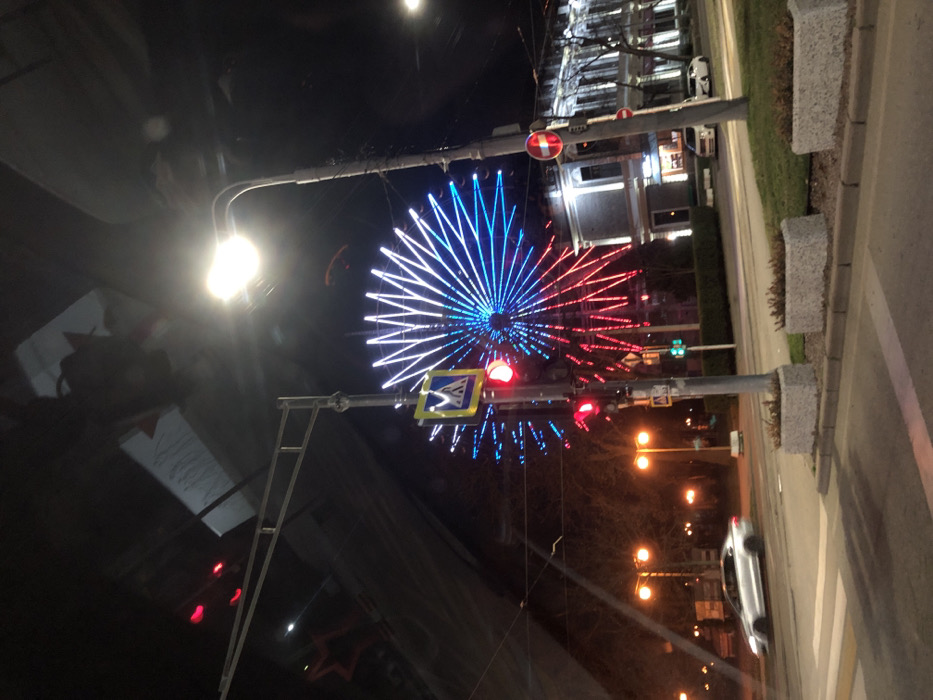 This is a nighttime photograph of an urban street intersection in Unknown, Unknown. The scene is illuminated by artificial light sources including streetlights, traffic signals, building lights, and a prominent Ferris wheel. In the foreground, a multi-lane asphalt road with a marked pedestrian crosswalk runs horizontally. A silver four-door sedan is observed in motion on the leftmost lane, heading away from the viewer. A concrete pole, situated on a grassy median strip, supports multiple components: an overhead metal framework, a square blue pedestrian crossing sign depicting two white figures, and two vertically aligned red traffic lights for vehicular traffic. A smaller green traffic light is partially visible below the red ones. On the median, two rectangular concrete planters contain sparse, dark vegetation. Reflections of internal structures and a red star-shaped object are visible in the upper left portion of the image, suggesting the photograph was taken from inside a vehicle or building looking outwards through glass. The midground features a large Ferris wheel, brightly illuminated with LED lights arranged in radial patterns. The lighting configuration displays blue in the center, transitioning to white, then red, covering the majority of the wheel's circumference. To the right of the Ferris wheel, a multi-story, classically styled building with illuminated windows stands, with several vehicles (a white van and a darker car) parked in front of it. A red circular "No Entry" sign with a white horizontal bar is affixed to a pole near this building. To the left of the road, a park area is visible, containing several bare trees and multiple streetlights emitting a warm yellow glow. The sky is dark. No people are explicitly visible.