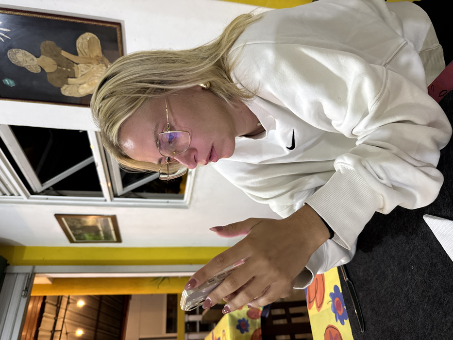 The scene depicts a female individual seated at a dining table within what appears to be a restaurant in Bentota, Sri Lanka, during nighttime hours. The individual, who has blonde hair and is wearing a white sweatshirt with a black Nike swoosh logo on the chest, is observed in profile, looking down intently at a smartphone held in both hands. She wears large, rectangular, gold-rimmed glasses and a single gold hoop earring in her visible right ear. Her fingernails are manicured with a light pink polish. The smartphone is encased in a clear, possibly jeweled or textured case. The table features a black placemat, on which a folded white paper napkin and a knife with a black handle are visible. To the left, another dining table is partially visible, covered with a yellow tablecloth patterned with multi-colored shapes resembling fruits or flowers. The background consists of a white wall. Two framed pictures adorn the wall: a smaller, rectangular brown-framed image to the left, and a larger, dark-framed artwork to the right depicting a stylized, crouching female figure, possibly crafted from natural fibers or a relief. Below the larger artwork, two windows reveal darkness outside. To the far left, a bright yellow architectural element, possibly a pillar or wall section, is visible, extending towards an overhead structure with exposed beams and string lights, indicating an open or semi-open dining area.