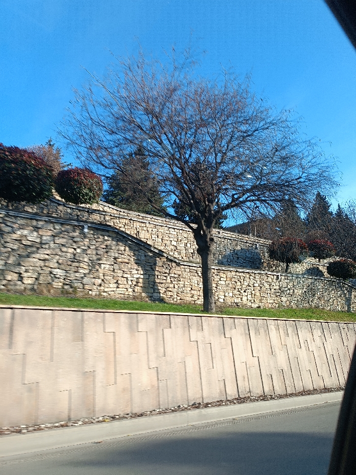 A leafless tree stands centered against a stepped stone wall, accented with shrubs on top. Below, a concrete wall with geometric patterns flanks a road. The sky is clear and blue. Part of a car is visible on the lower right.