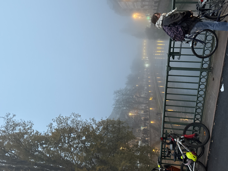 The image presents a foggy urban waterway scene in Strasbourg, France, likely at dawn or dusk, characterized by low visibility and illuminated artificial lights. A canal or river occupies the middle ground, its surface reflecting numerous orange streetlights from both banks. In the foreground, a dark green metal bridge railing with a repeating circular motif runs horizontally. On the left side of the bridge, two bicycles are parked against the railing; one is a white mountain bike with red suspension forks and a yellow helmet attached. On the right, a person, appearing female, stands facing left next to a dark blue bicycle, which leans against the railing. This individual wears a dark jacket, blue jeans, and a white and black plaid scarf, with a patterned backpack on their shoulders. A small piece of white litter is visible on the bridge surface near the bottom center. Along the left bank of the waterway, a discernible group of people walks on a pathway illuminated by additional streetlights. The right bank also features buildings and trees, all progressively obscured by the dense fog, creating a diffused, hazy atmosphere throughout the background. Large deciduous trees with some remaining yellowish-brown foliage frame the upper left portion of the scene.
