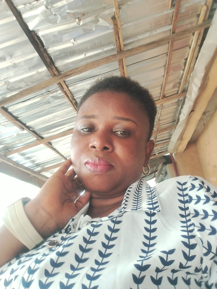 The image displays an adult female subject situated within a semi-enclosed structure, located in Aba, Nigeria