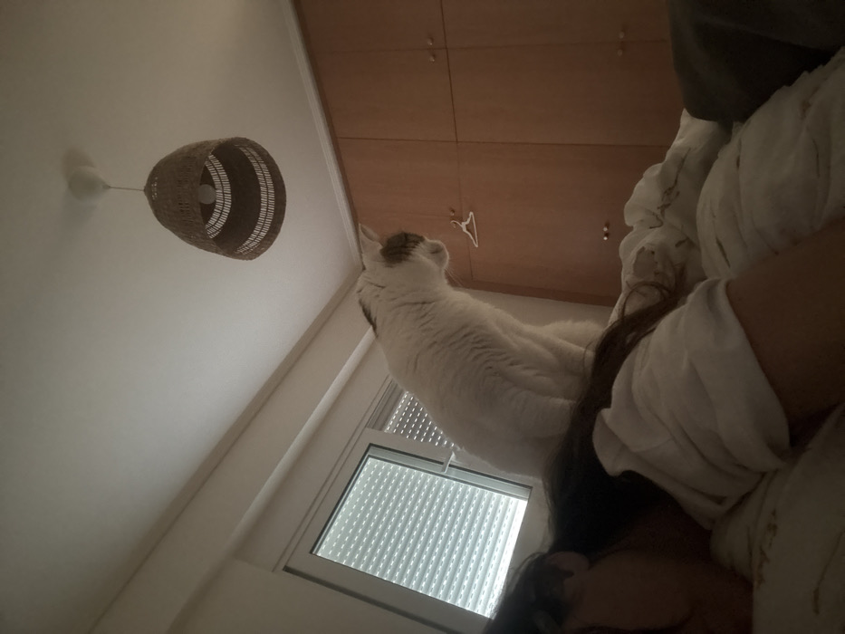 The image depicts a dimly lit bedroom scene in Anavissos Municipal Unit, Greece. A person with long dark hair is seen lying on a bed on the left, mostly obscured by bedding, wearing a white long-sleeved top. A large domestic cat, predominantly white with brown markings on its head, is seated upright on the bed directly behind the person's head, facing away from the person towards the right side of the room. In the background on the left, a white-framed window with horizontal white blinds is visible. On the right, a light brown wooden wardrobe with multiple paneled doors and brass-colored handles occupies the wall. A single white plastic clothes hanger is suspended from one of the wardrobe handles. A brown wicker-style pendant light fixture hangs from the white ceiling. The room is illuminated by ambient light, suggesting low-light conditions.