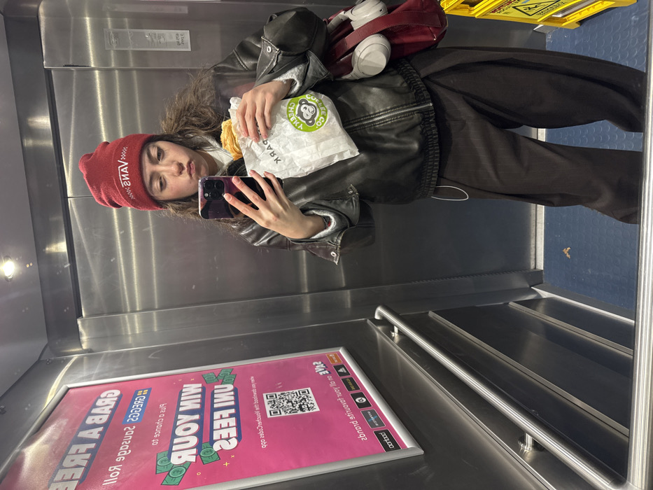 The scene is an elevator interior, likely within a student accommodation or university building in Hull, United Kingdom. The walls are composed of brushed metallic panels, and the floor is a dark blue. On the left wall, a pink promotional poster is displayed, advertising "GRAB A FREE GREGGS SAUSAGE ROLL" and a "WIN YOUR UNI FEES" competition via a QR code linked to the VoucherCodes app. A metal handrail is affixed below the poster. A partial yellow "wet floor" warning sign is visible on the floor to the right. A female individual, appearing to be in her late teens or early twenties, stands centrally, taking a selfie with a dark-colored smartphone held in her left hand. She has dark, wavy hair and wears a red beanie with a white "VANS" logo. Her expression shows pursed lips. She is dressed in a dark, possibly leather, bomber-style jacket over a lighter inner layer, and wide-leg dark pinstriped trousers. A white wired earbud or cable hangs from her left side. In her right hand, she holds a white paper bag from "PARK CHEEKY COFFEE CO.", from which a light-colored pastry is partially visible. A red shoulder bag, containing white over-ear headphones, hangs from her right shoulder.