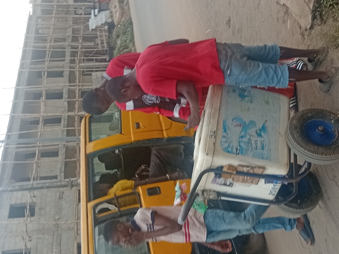 Three boys stand around a white ice cream cart, two wearing red shirts and the third in a striped shirt. A yellow bus is parked next to them. In the background, a multi-story building under construction is visible with its concrete frame and wooden scaffolding. The scene appears to be set outdoors, possibly in a residential or commercial area.