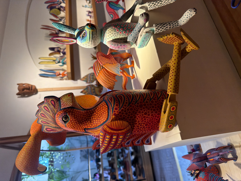 The image showcases a collection of vibrant, handcrafted alebrijes