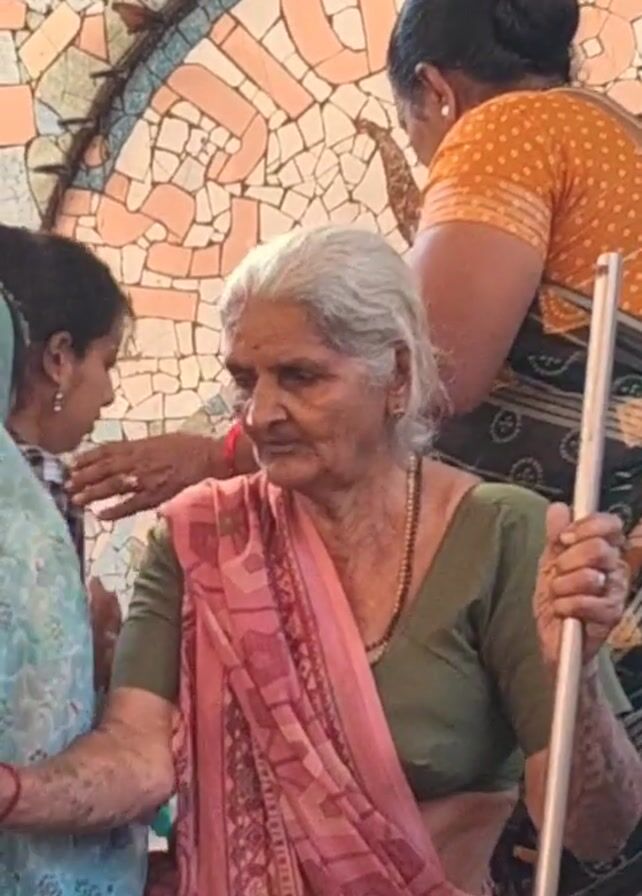An elderly woman with gray hair, wearing a green blouse, a pink and red shawl, and a beaded necklace, is standing and holding a silver cane with both hands. She is surrounded by other people and looks slightly to the left. A woman in a yellow polka-dot top is behind her. Behind them is a wall covered in colorful tiles. The woman is standing outdoors.