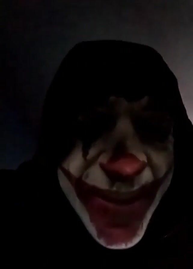 The video features a close-up shot of a person wearing a menacing clown mask with a dark hood. The mask is white with black markings around the eyes and a wide red smile and nose. The person’s face is partially obscured by shadows, adding to the eerie atmosphere. The background is dark, suggesting a dimly lit environment, and the perspective is from a low angle, making the figure appear looming.