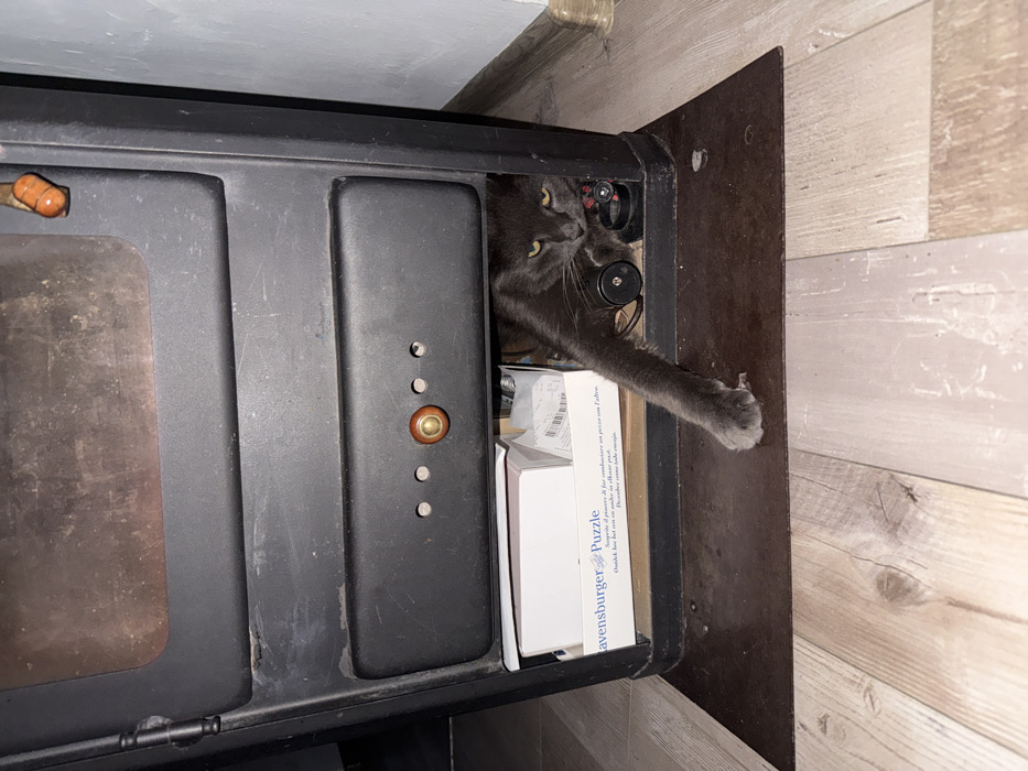 - "A gray feline, with prominent yellow eyes, is observed partially concealed within the open lower storage compartment of a dark-colored, freestanding wood stove" by FM-zk5wI2, licensed under CC BY 4.0