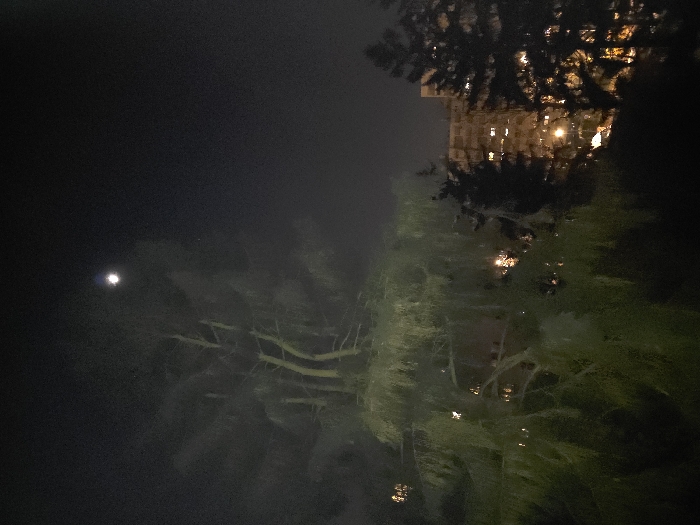 A nighttime scene features a faint moon in the upper left. Reflected light from a multi-story building is visible at the top. A dark tree silhouette dominates the upper right. The water surface reflects the building, creating a distorted, ethereal image. Wispy shapes and light patterns suggest the movement of water and the presence of foliage. The overall composition is dark, emphasizing the interplay between light and shadow.