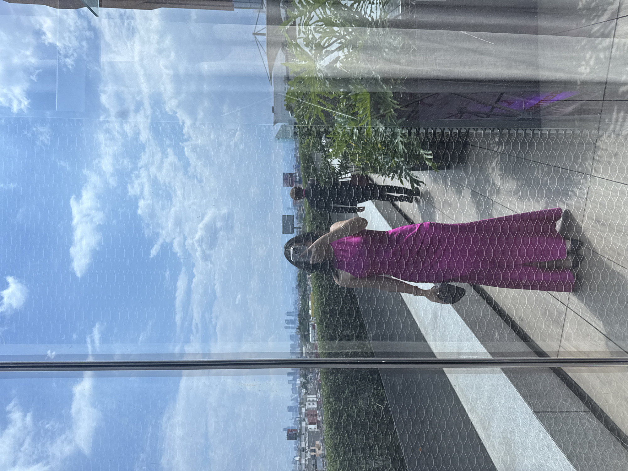 A reflective window frames an outdoor scene and the reflection of a woman. The upper half of the window displays a cloudy sky, the reflection of the outdoors, and the woman's reflection. The woman is wearing a magenta dress and holding a black object. Reflected in the upper area of the window is outdoor vegetation and a person walking in the outdoor scene. The lower half of the window has a view of Mexico City, with a low horizon line in the distance. The sky is a very light blue.