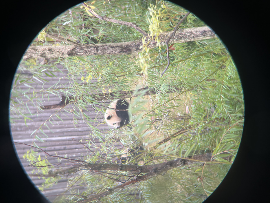 The image, viewed through a circular optical device, depicts a giant panda resting in an outdoor enclosure