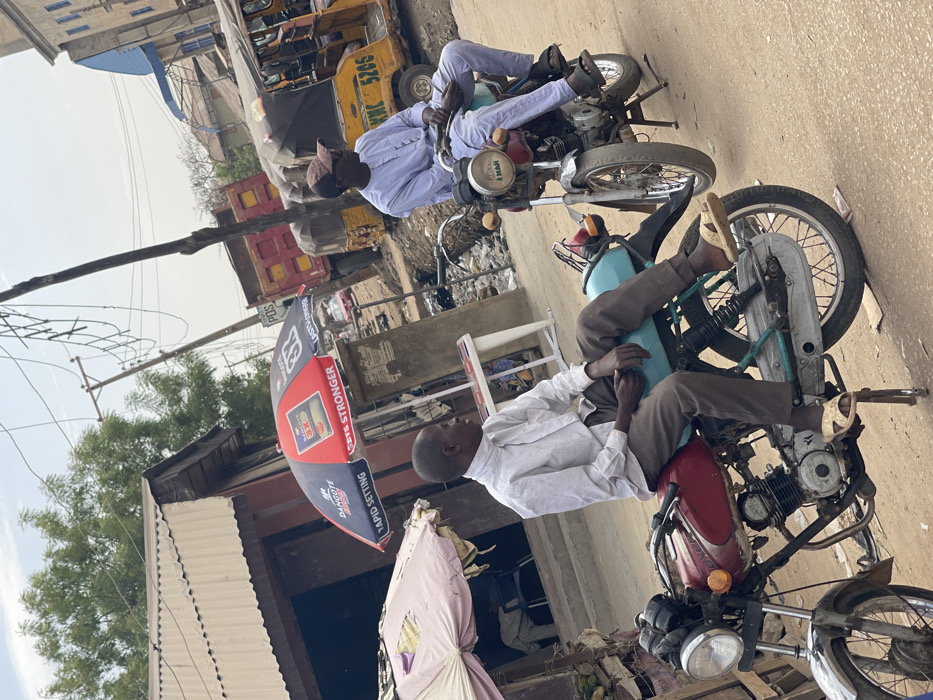 A street scene in Zaria, Nigeria, depicts two men resting on motorcycles on an unpaved road