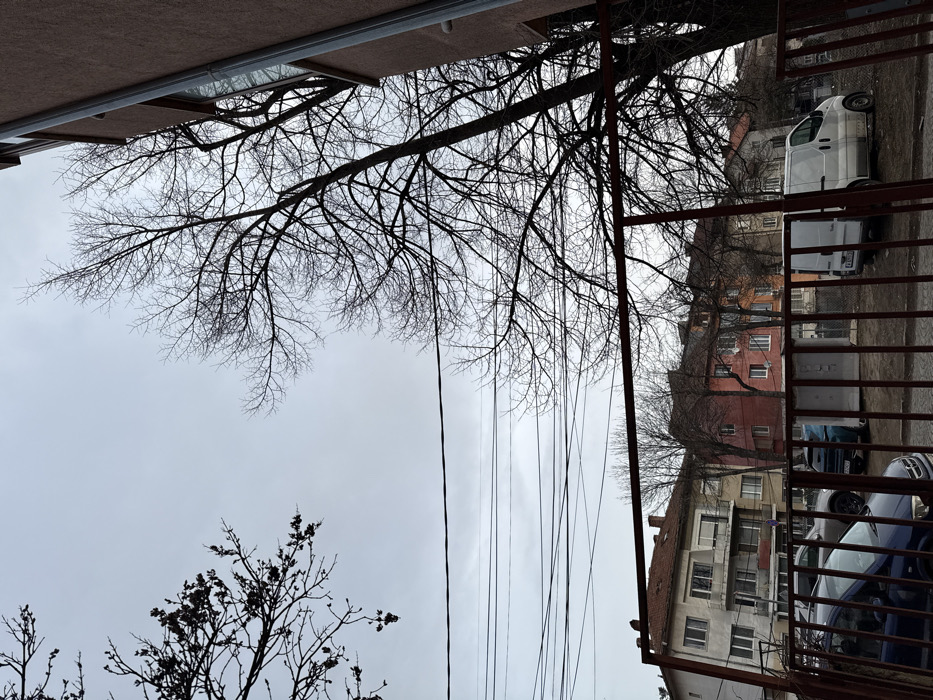 The image depicts an urban residential scene in Sofia, Bulgaria, characterized by an overcast, light grey sky dominating the upper half