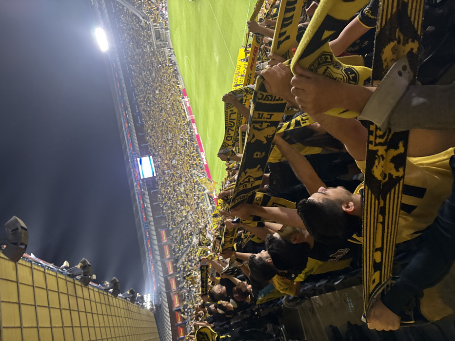 The image displays a nighttime scene within Teddy Stadium, located in the Malha neighborhood of Jerusalem, Israel. The foreground features a dense crowd of predominantly male spectators, viewed from an elevated position. These individuals are wearing yellow shirts, some with black accents, and are actively holding black and yellow scarves aloft. Many scarves are emblazoned with Hebrew text, including "ירושלים" (Jerusalem), and a black lion silhouette. The spectators' faces are generally oriented towards the brightly illuminated green football pitch. The stadium is filled with numerous other spectators, largely uniformed in yellow, stretching into the background. Overhead, stadium floodlights illuminate the scene, casting light across the stands and the playing field. A digital scoreboard is visible in the upper background. The stadium's structural elements, including metal gridwork and suspended speakers, are visible against the dark night sky. The scene depicts an active fan demonstration during a live sporting event.