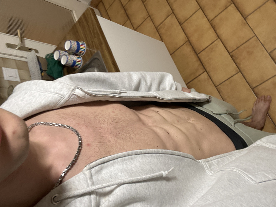 The image displays a male individual standing indoors in what appears to be a kitchen or kitchenette in Villaz, Switzerland. The subject is cropped from the mid-chest to the feet, revealing a lean build with visible abdominal musculature and light body hair on the chest and abdomen. He is wearing an unzipped light grey hooded sweatshirt, a silver-colored chain necklace, light-colored sweatpants with a visible black waistband, and is barefoot. To the right of the subject, a light brown countertop features a small, metallic sink. Three identical paper cups, patterned with colorful stripes, are inverted on the countertop near the sink, with a dark green cloth visible behind them. White base cabinets are situated below the countertop. The floor is covered with rectangular, light brown tiles. In the background, a light-colored wall contains a white electrical outlet and a portion of a door with a silver handle.