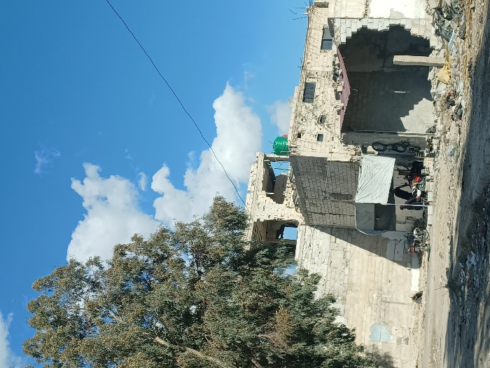 - "An outdoor scene in Al-Qadam Municipality, Syria, depicts a damaged urban environment under a clear blue sky with scattered white cumulus clouds" by FM-hmmxi2, licensed under CC BY 4.0