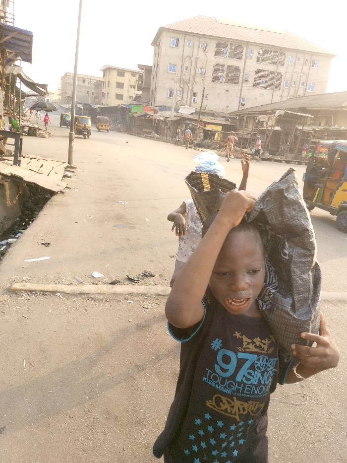 A child carries heavy bags in a bustling street, wearing a black T-shirt with a "Tough Enough" graphic