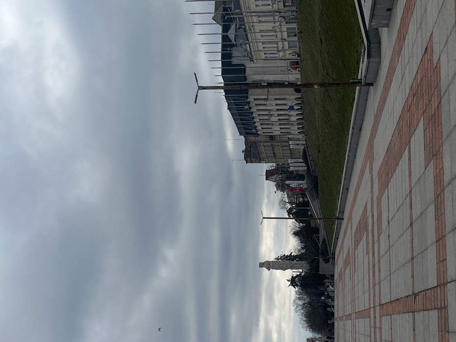 This image depicts a public plaza in Shumen, Bulgaria, specifically Freedom Square (Площад Свобода), with the Shumen Regional Administration building and the Monument of Liberty (Опълченец) visible. The scene is dominated by an expansive paved plaza in the foreground, constructed from light gray/beige and reddish-brown rectangular tiles arranged in a geometric pattern. Two dark, modern streetlights with inverted Y-shaped luminaires stand on the paved surface, one in the mid-left and another further right. A low gray concrete border separates the plaza from a rising, unkempt brown-green grassy slope on the right. In the midground, to the left, a tall, light-colored monumental statue of a standing human figure, identified as the Monument of Liberty, is situated on a pedestal. Behind it and further to the left, bare deciduous trees are visible, indicating late autumn or winter. A series of white vertical panels or pillars, interspersed with red and blue flags or banners, are arranged along the base of the buildings on the ascending slope. Several indistinct human figures are visible in the far left background, walking on a path near the monument. The background features multiple multi-story buildings. Prominently on the right is a large building with a light-colored facade, numerous windows, and a distinctive line of vertical flagpoles along its roofline, identified as the Shumen Regional Administration building. To its left, another multi-story building with a darker facade is partially visible. The sky is heavily overcast, filled with uniform gray clouds, and a small, dark, V-shaped object (likely a bird) is visible in the upper left quadrant.
