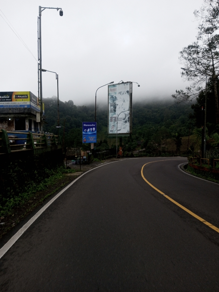 The image displays a winding asphalt road under an overcast and foggy sky in Deothang, Bhutan. The road features a solid white line marking its left edge and a solid yellow line indicating the center as it curves to the right. No vehicles or individuals are visible on the road. On the left side of the road, a partial view of a multi-story building is present, displaying "Alkaline" signage in yellow and black. Adjacent to this building, a tall metal pole supports a CCTV camera at its top and two streetlights positioned lower down. A green metal barrier or railing extends along the road's left edge, behind which dense green vegetation grows. A "TOILET" sign is affixed below this railing. On the right side of the road, a prominent, tall billboard with a damaged, peeling poster advertises "Space." Beneath it, a smaller blue rectangular billboard displays "Hannochs" branding. A streetlight is attached to the support structure of the larger billboard. The background consists of densely forested hillsides, with the upper portions obscured by thick fog, blending into a uniformly light gray sky. A tall, slender tree with minimal foliage is visible on the far right. The immediate surroundings of the road are characterized by lush green undergrowth.
