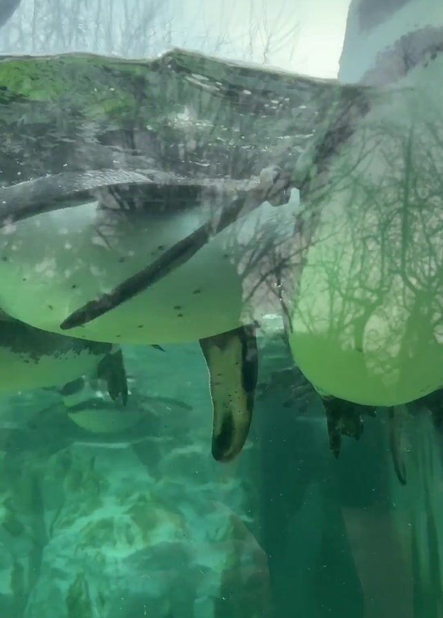 view through a clear glass enclosure of penguins swimming underwater. The water appears green. The penguins' bodies are visible beneath the surface, and above the water line, the reflection of bare trees is visible. Bubbles float through the water. The penguins move through the water with their flippers.