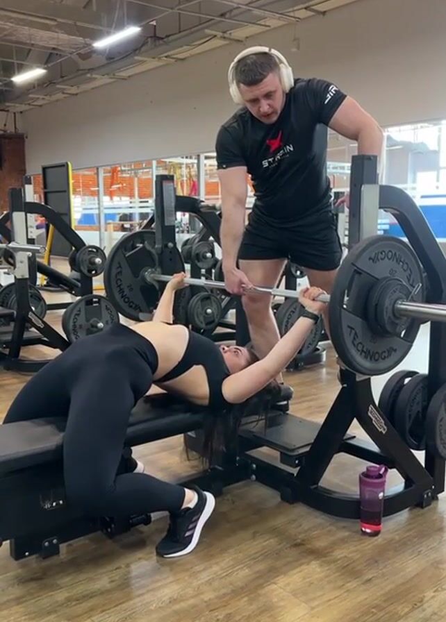 A young woman is performing a bench press exercise at a gym, with a male trainer assisting her