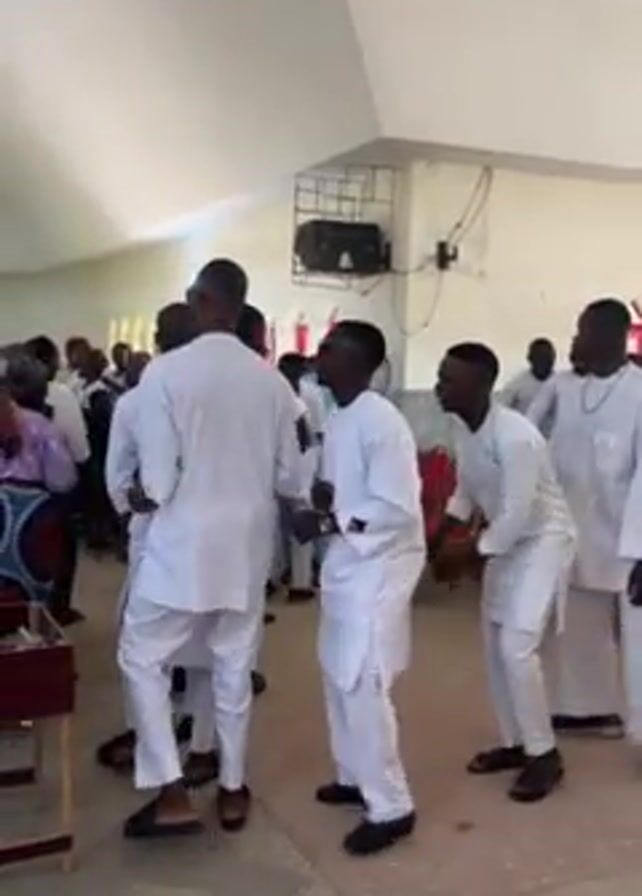 A group of men are dancing in a room with a vaulted ceiling. They are all wearing white outfits and black shoes. The room appears to be a church. The men are dancing to some sort of music. There are some women standing at the front of the room.