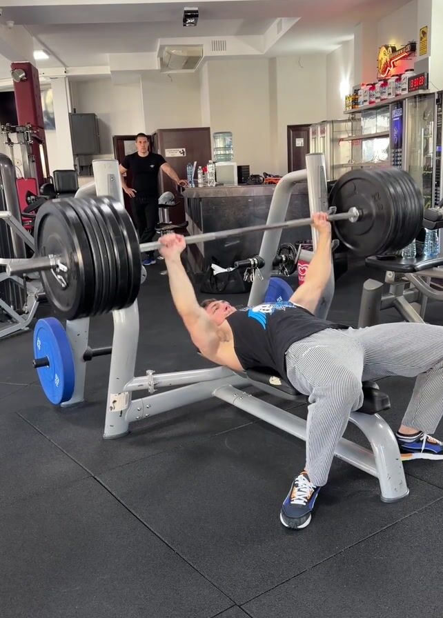 muscular man in a black tank top and striped pants performing a bench press in a gym. He is lying on a gray bench press machine and lifting a barbell loaded with many black weight plates. A spotter in a black shirt and pants stands nearby, observing the man. The gym is brightly lit and includes various weightlifting machines, a water cooler, and a display case with supplements. The floor is covered in black rubber mats.